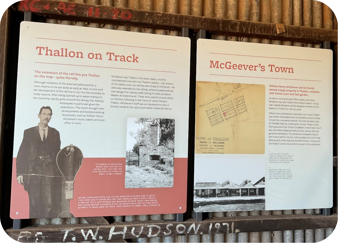 The Goods Shed, which features signatures from former rail employees, provides a historic backdrop for the Exhibition of engaging information and images outlining Thallon’s rich rail heritage, including QR Code links to Rail Tails as told by Thallon Locals.